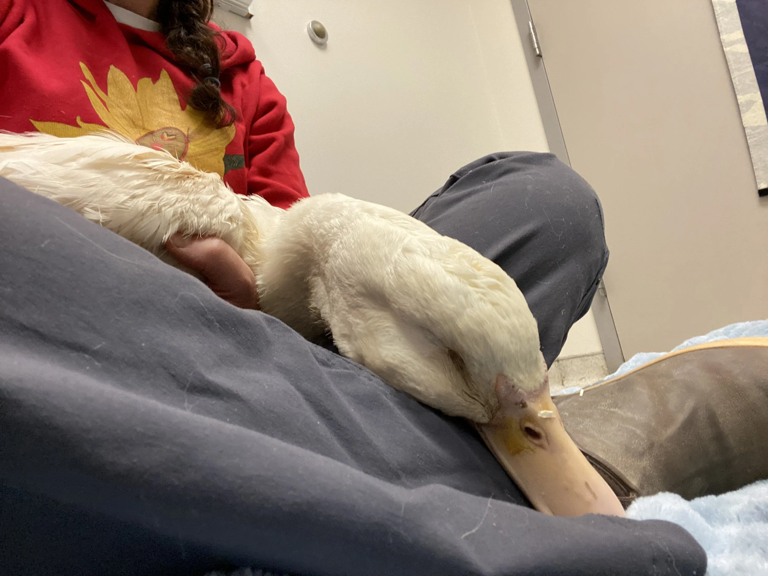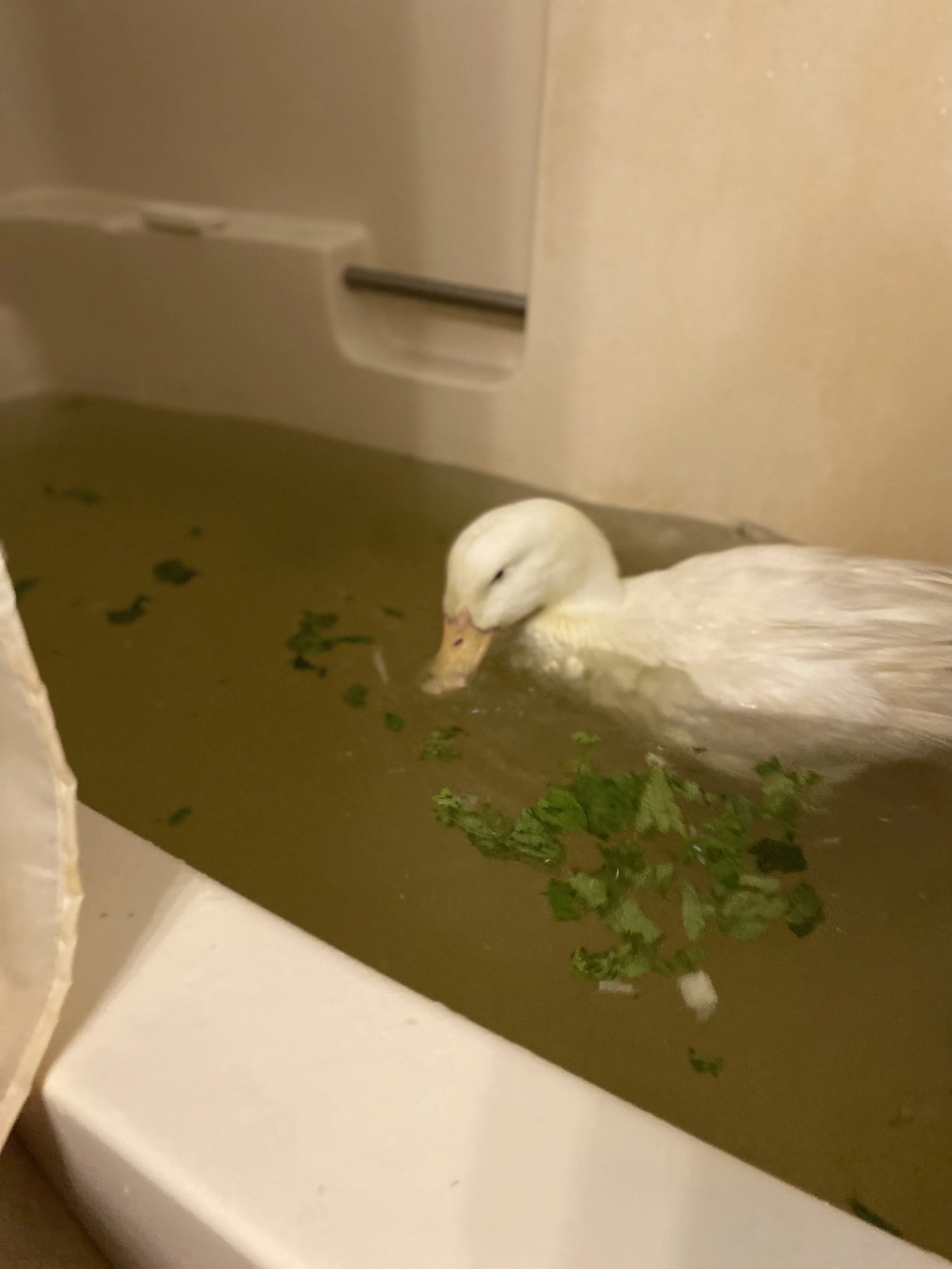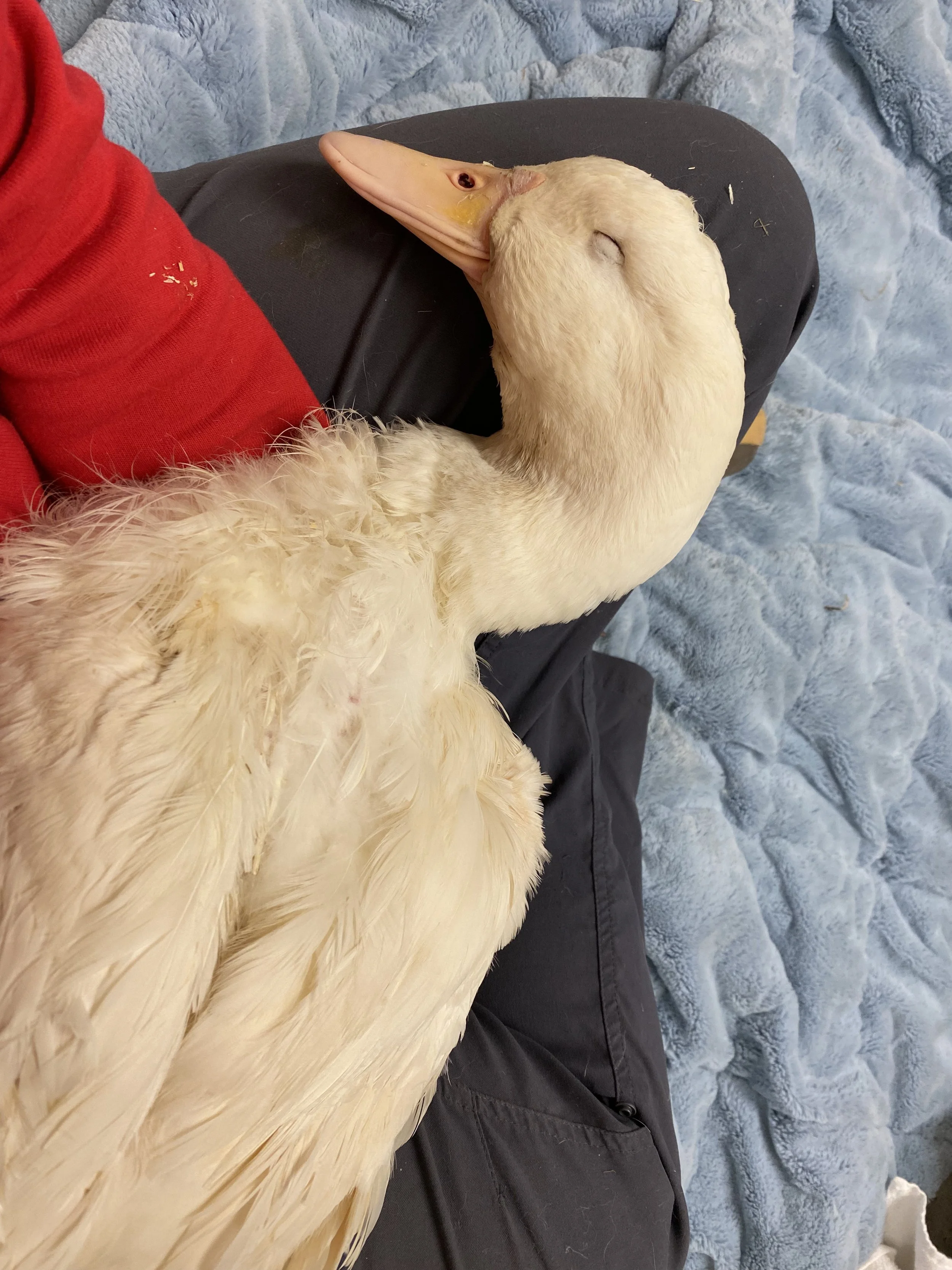 Last April Gene was diagnosed with heart disease. We immediately started Gene on multiple heart medications and until Tuesday his heart had improved with each 3-month checkup he received. Gene this past year also was dealing with a severe sinusitis. But daily hot compresses and nebulizer sessions with saline solution, helped clear Gene up. In November, he was diagnosed with stage four arthritis in both hips and knees. This caused Gene to be mostly immobile, but despite everything he was still a happy duck with a strong will to live. We gave him medications twice daily to help ease any pain or inflammation from his arthritis, hoop therapy, daily warm baths in the bathtub, a full blow-dry, followed by time to preen, and rest in front of the fireplace. We purchased Gene a specially designed wheelchair to help him get around, but he wanted nothing to do with it. Always making his way out of it within minutes. Gene maintained a great appetite, his energy level remained high, especially in the tub! And he showed us each day that he was happy to be alive and was a content, happy duck. Every afternoon when we’d carry him back down to his yard, Virginia and Nan would come running from their pond to greet him. So excited to have him back.