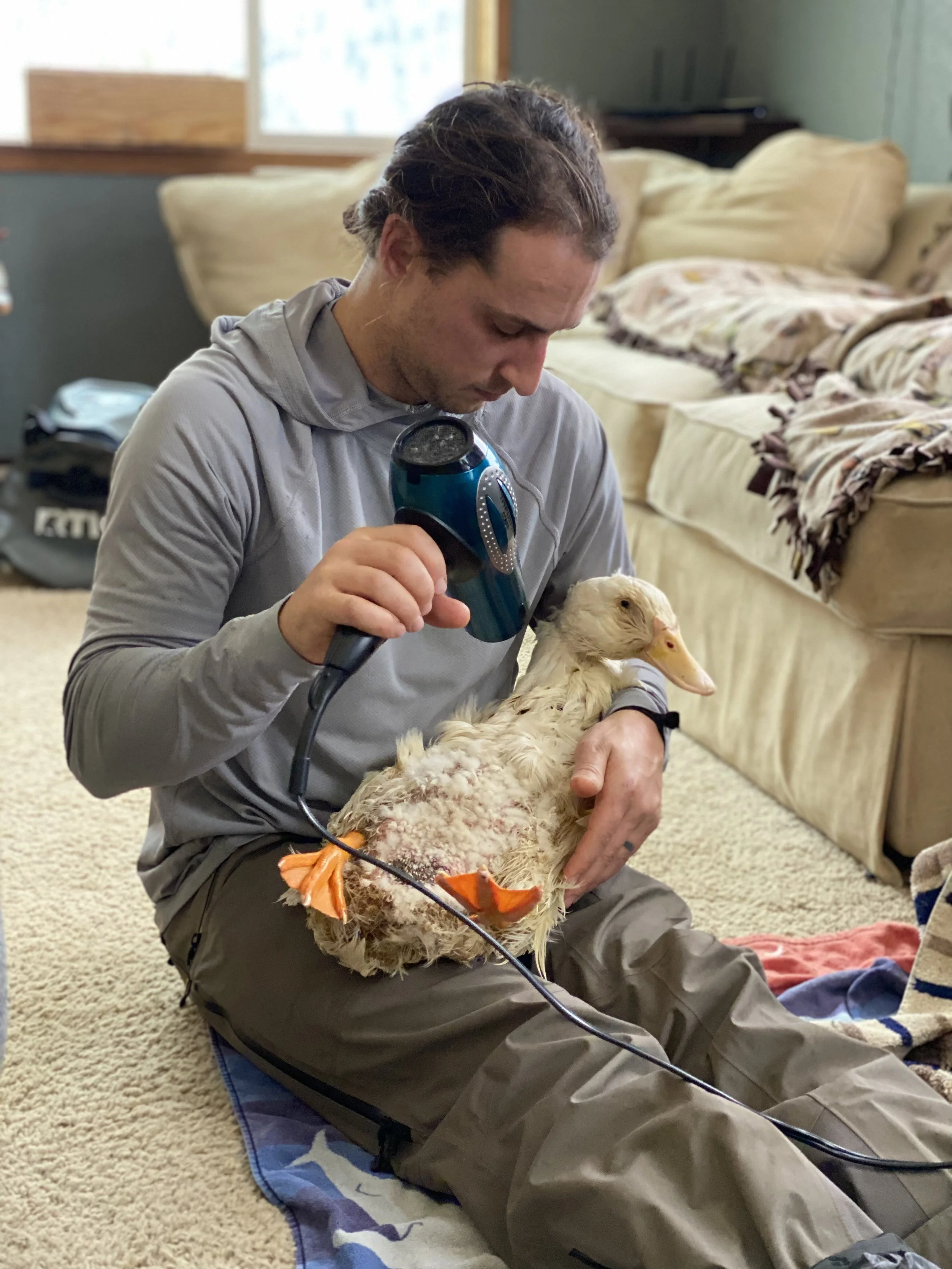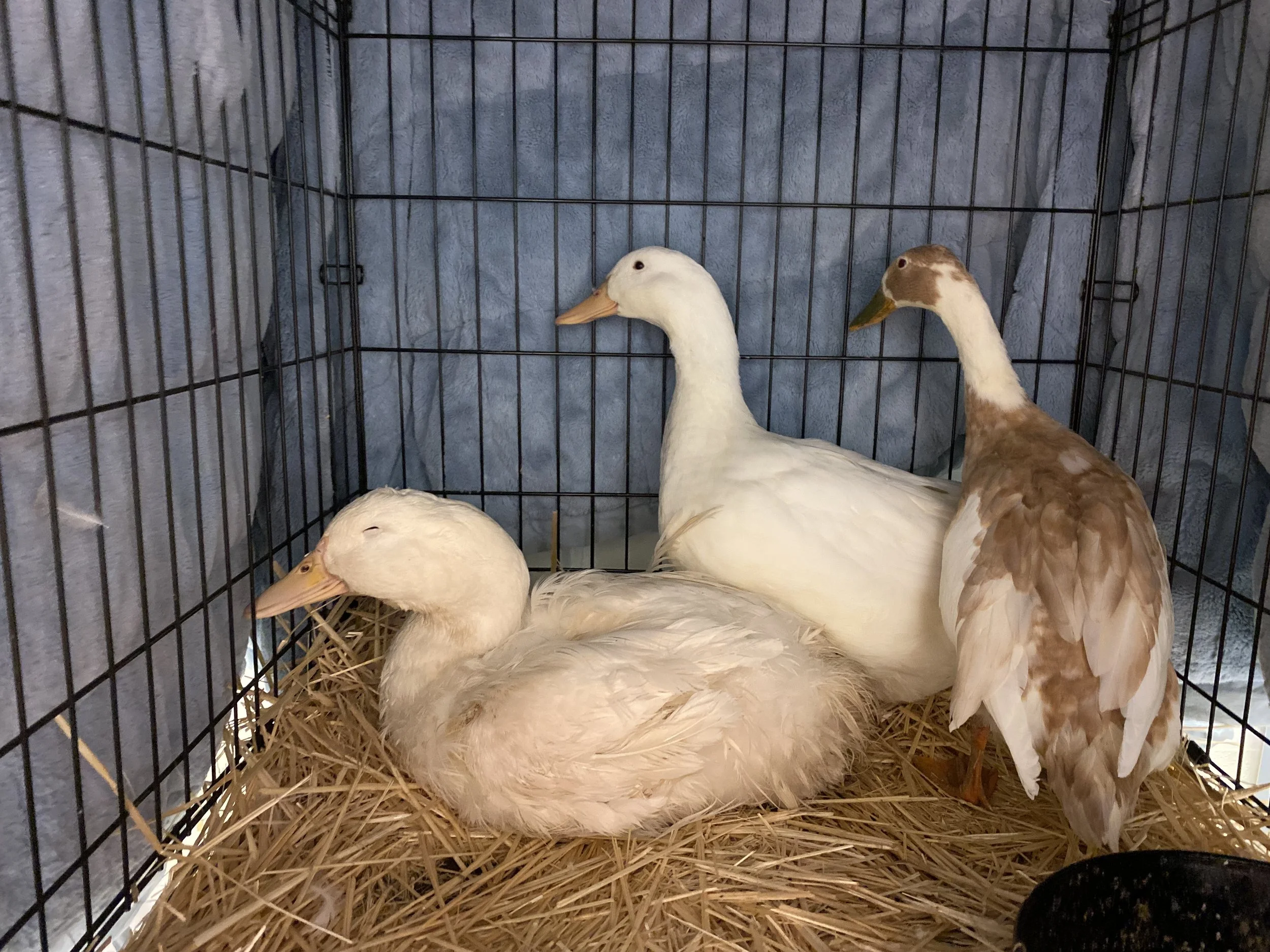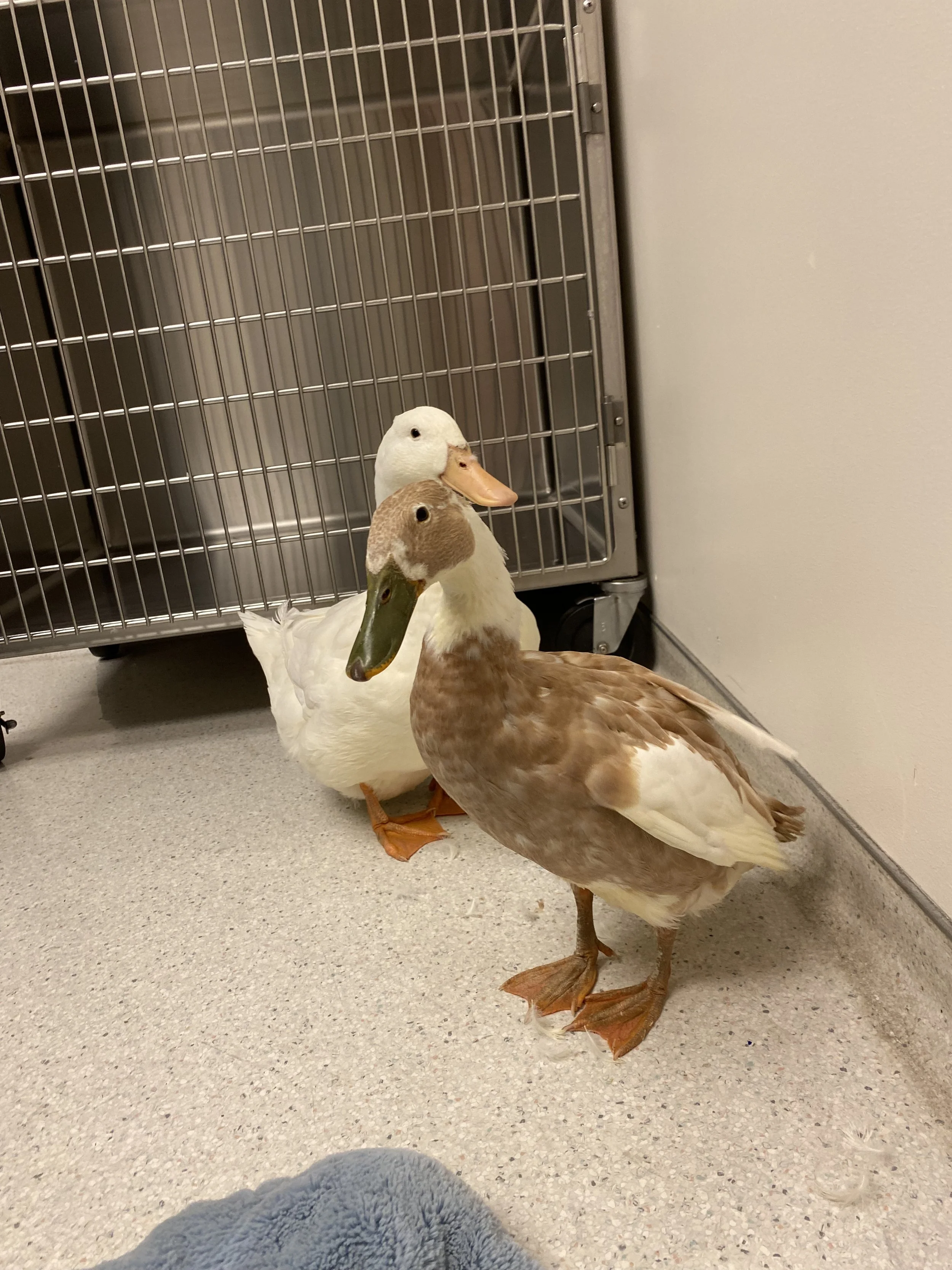 Last April Gene was diagnosed with heart disease. We immediately started Gene on multiple heart medications and until Tuesday his heart had improved with each 3-month checkup he received. Gene this past year also was dealing with a severe sinusitis. But daily hot compresses and nebulizer sessions with saline solution, helped clear Gene up. In November, he was diagnosed with stage four arthritis in both hips and knees. This caused Gene to be mostly immobile, but despite everything he was still a happy duck with a strong will to live. We gave him medications twice daily to help ease any pain or inflammation from his arthritis, hoop therapy, daily warm baths in the bathtub, a full blow-dry, followed by time to preen, and rest in front of the fireplace. We purchased Gene a specially designed wheelchair to help him get around, but he wanted nothing to do with it. Always making his way out of it within minutes. Gene maintained a great appetite, his energy level remained high, especially in the tub! And he showed us each day that he was happy to be alive and was a content, happy duck. Every afternoon when we’d carry him back down to his yard, Virginia and Nan would come running from their pond to greet him. So excited to have him back.