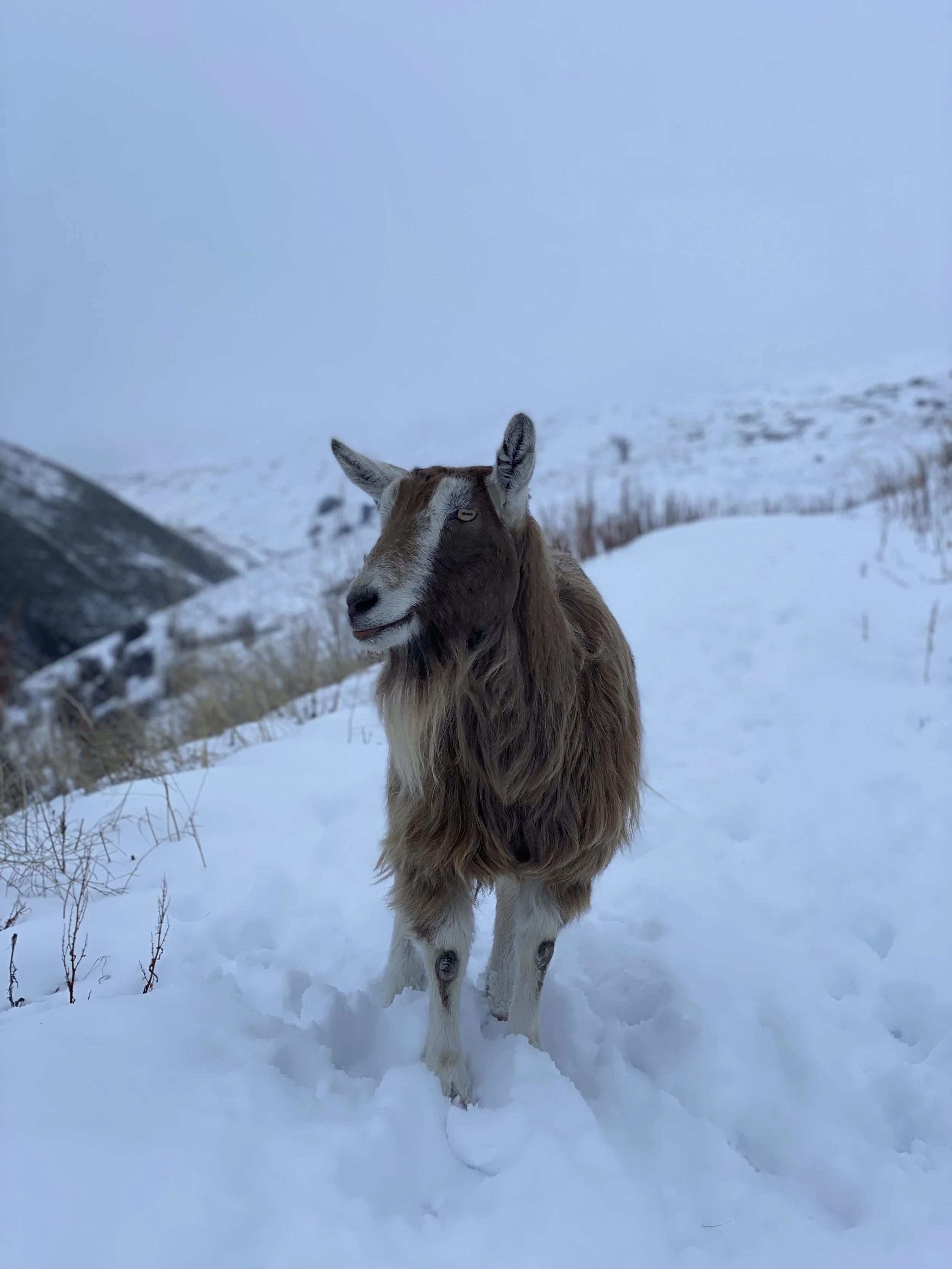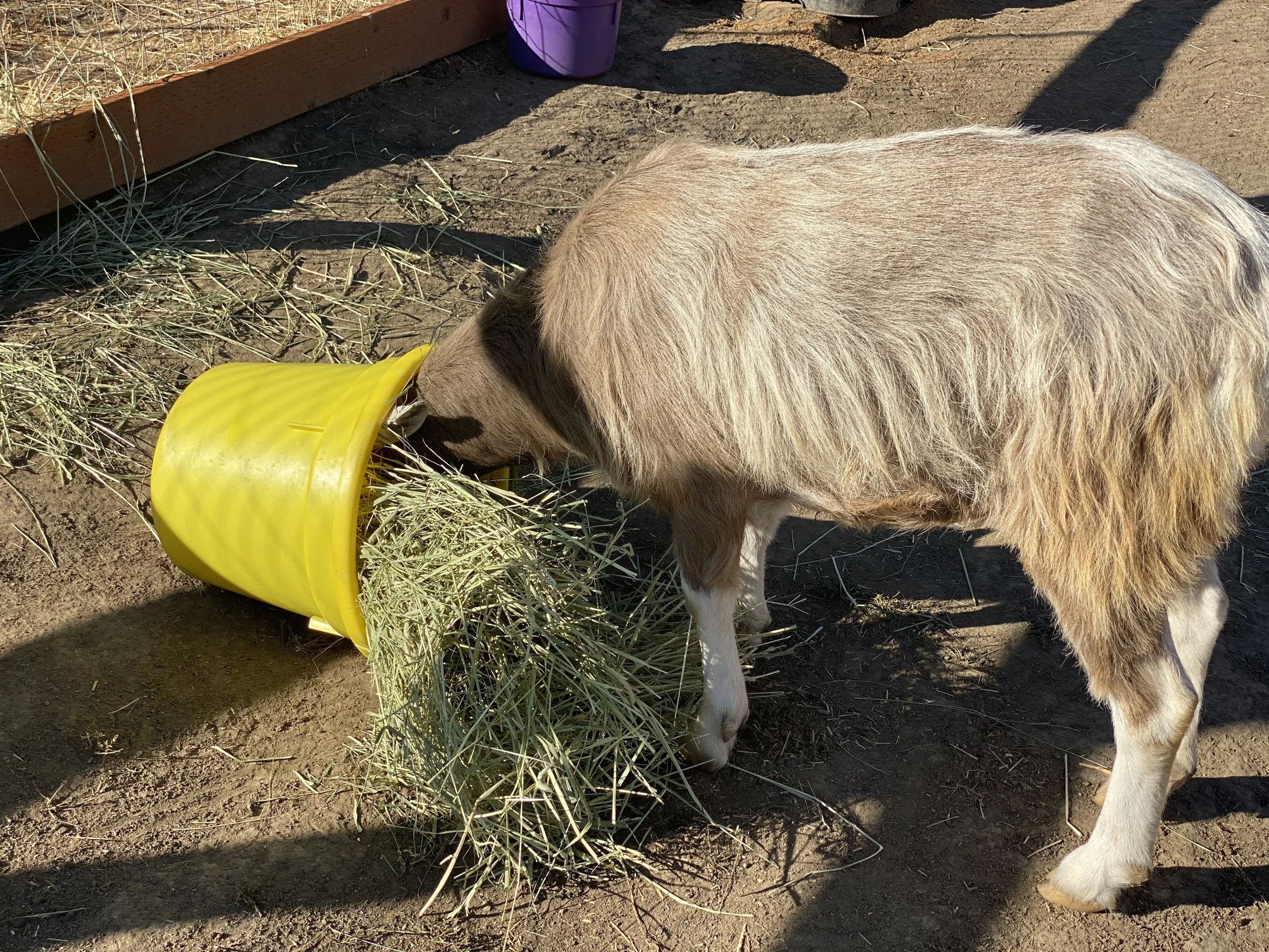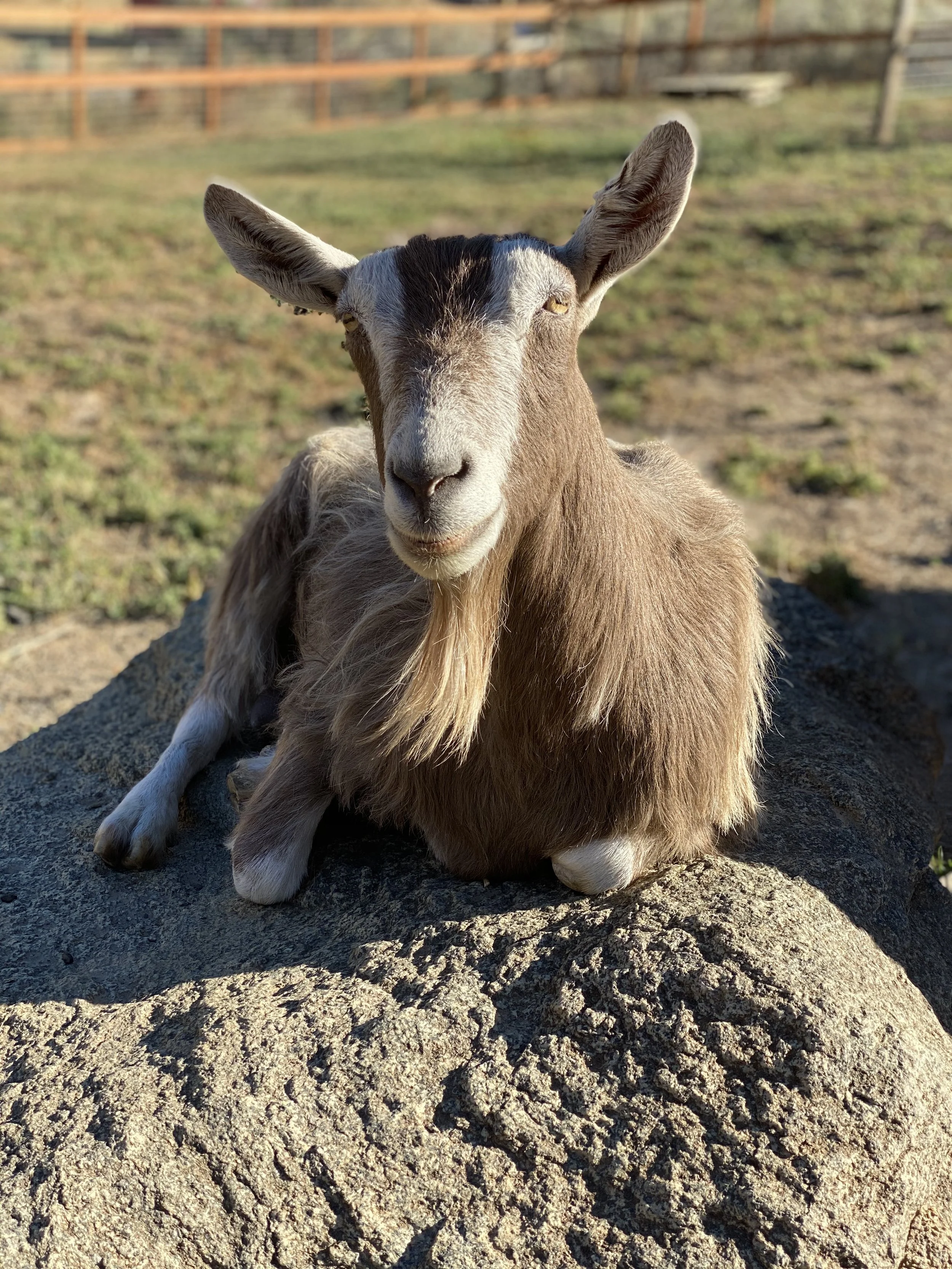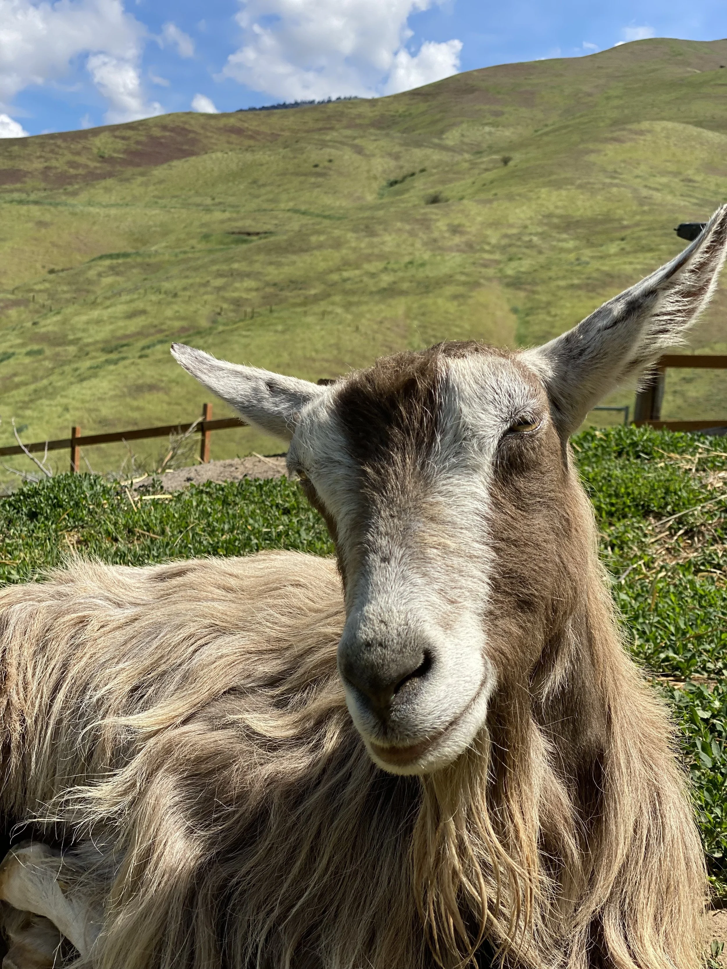 We brought Tulips home in July of 2019. We had recently organized as a WA non-profit, after finding Chino on the side of the road, raising funds to build him a proper home, and of course he couldn’t move in until he had a goat companion. Tulips was the one. I had seen her photo months before on a Petfinder alert with Whatcom County Humane Society in Bellingham. I fell in love with her sweet face and just knew that she was the one. After a long weekend of flying, I drove up to Bellingham and met this special girl. She was not interested in being touched or petted and was quite nervous about the whole thing. So we didn’t waste any time loading her up into the van where I had a large bucket of fresh hay, fresh water, straw bedding, and she nestled in for the loooonnnngggg ride home. She happily ate her hay up by the front seat, gazing out the window as my co-pilot, almost seeming to know, this was it. Her new home, where she would be loved and cared for, for the rest of her life.