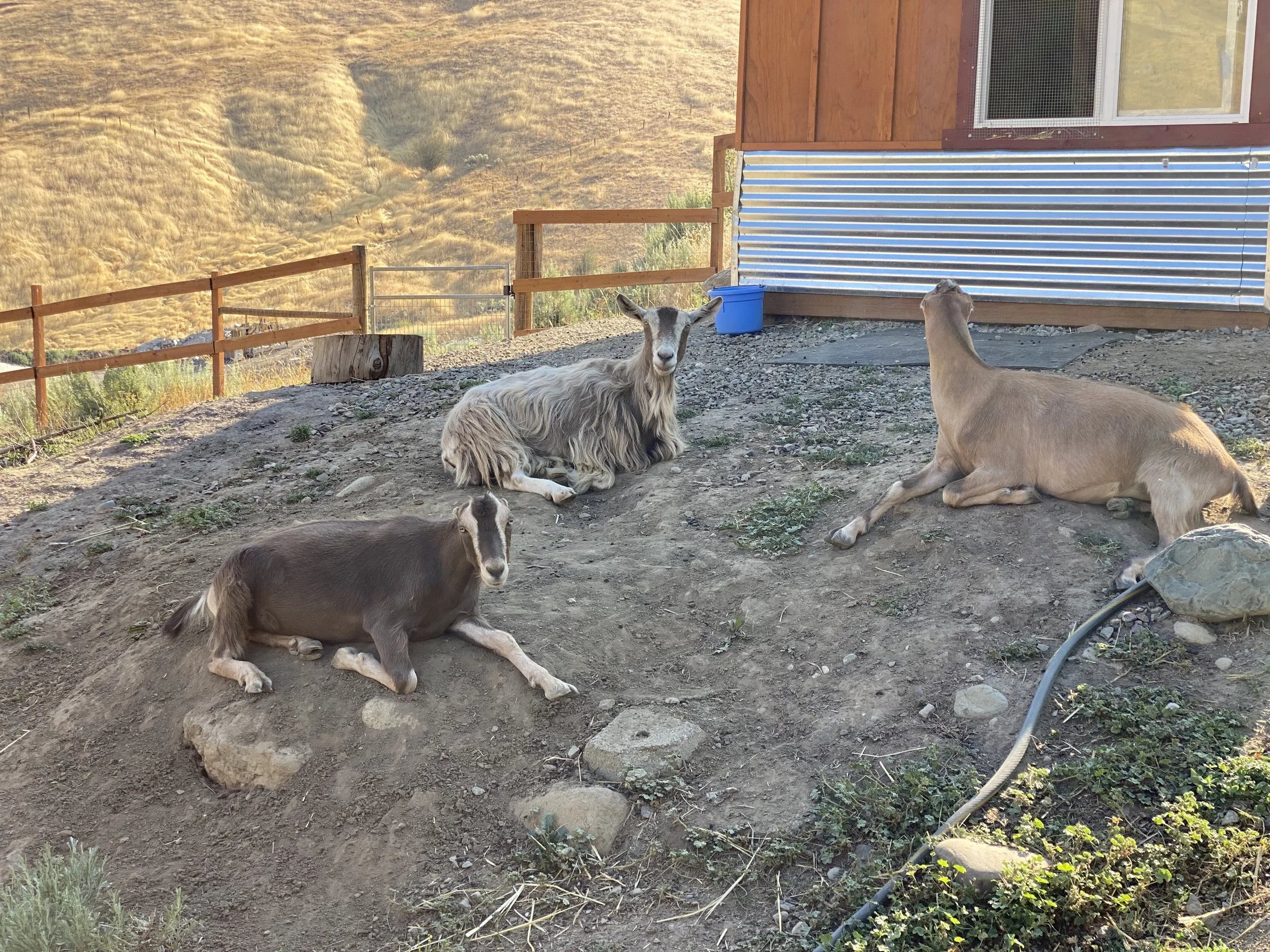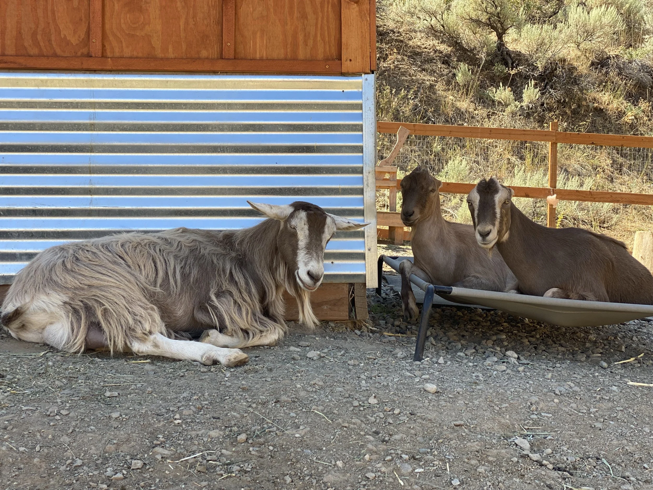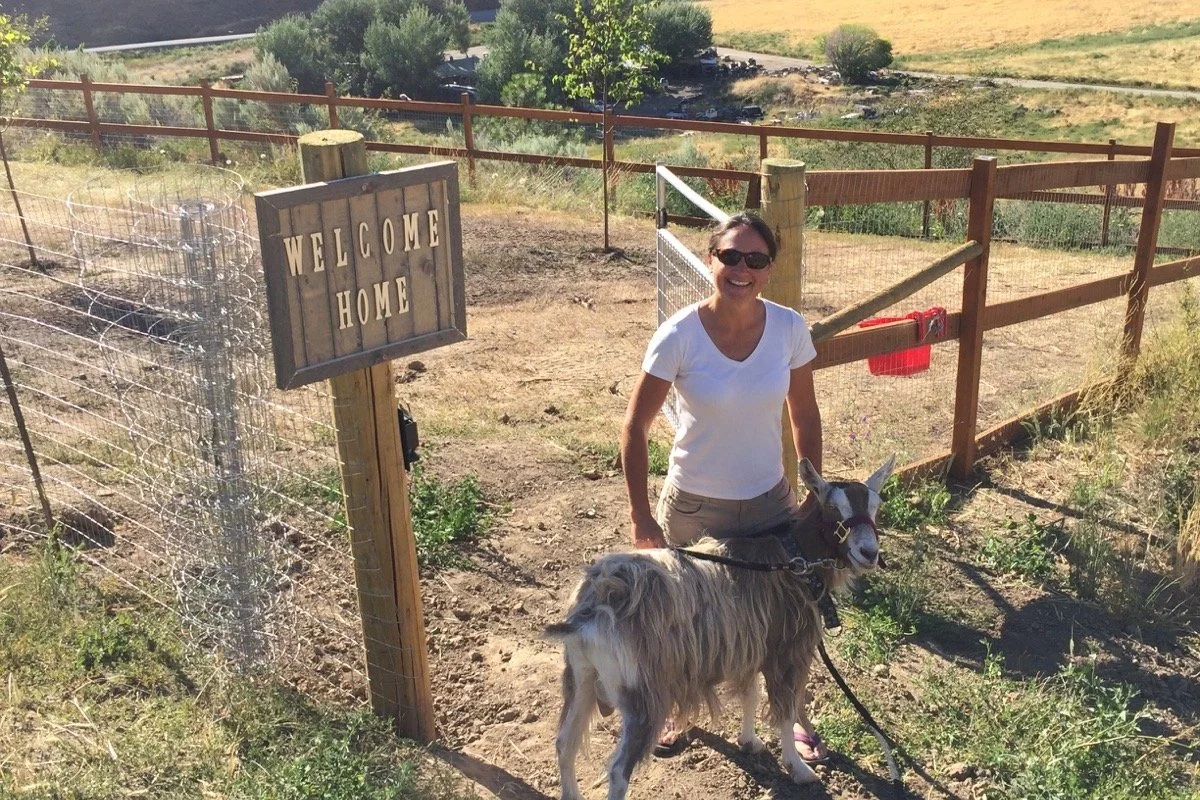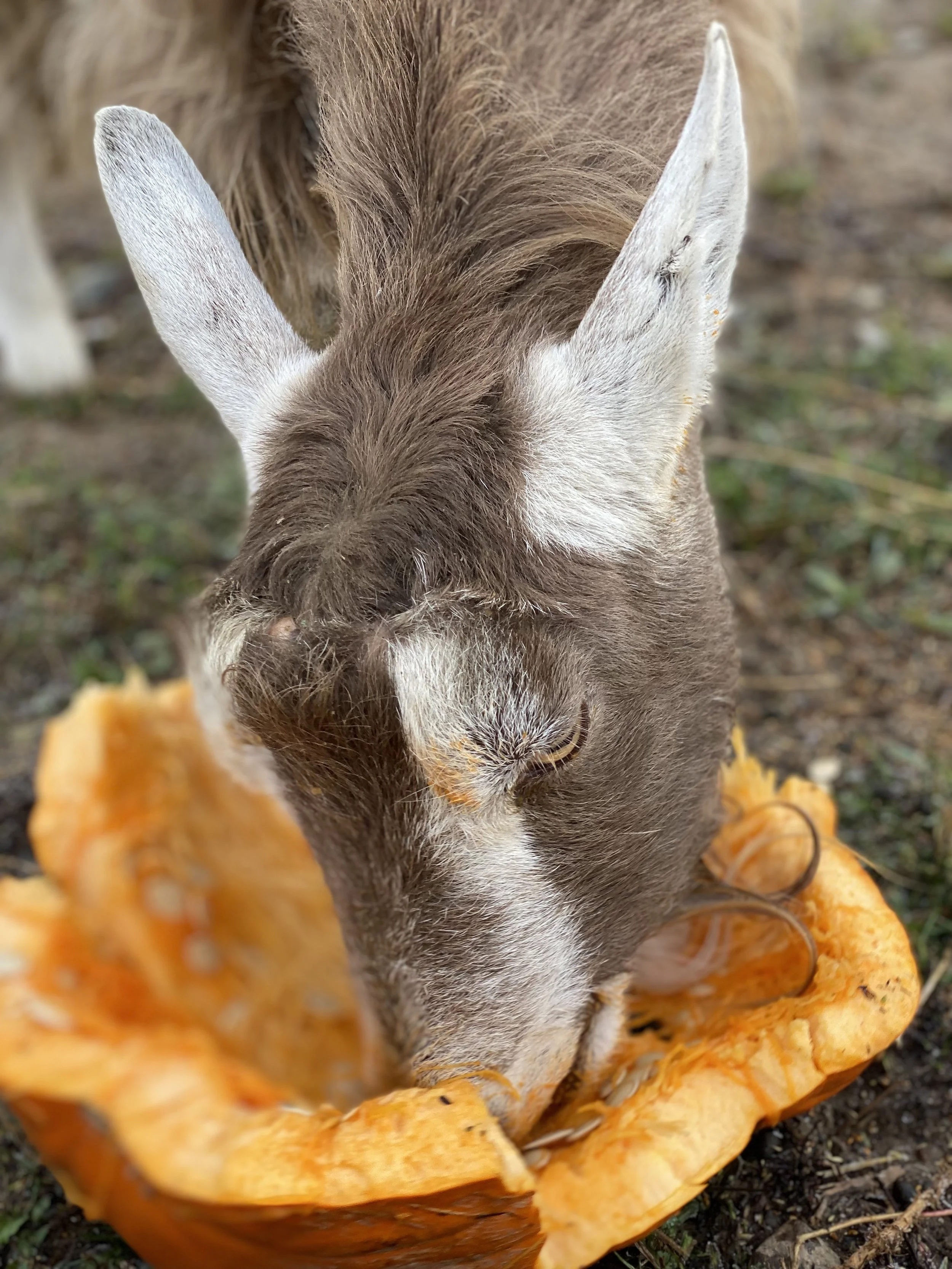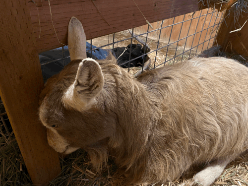 We brought Tulips home in July of 2019. We had recently organized as a WA non-profit, after finding Chino on the side of the road, raising funds to build him a proper home, and of course he couldn’t move in until he had a goat companion. Tulips was the one. I had seen her photo months before on a Petfinder alert with Whatcom County Humane Society in Bellingham. I fell in love with her sweet face and just knew that she was the one. After a long weekend of flying, I drove up to Bellingham and met this special girl. She was not interested in being touched or petted and was quite nervous about the whole thing. So we didn’t waste any time loading her up into the van where I had a large bucket of fresh hay, fresh water, straw bedding, and she nestled in for the loooonnnngggg ride home. She happily ate her hay up by the front seat, gazing out the window as my co-pilot, almost seeming to know, this was it. Her new home, where she would be loved and cared for, for the rest of her life.