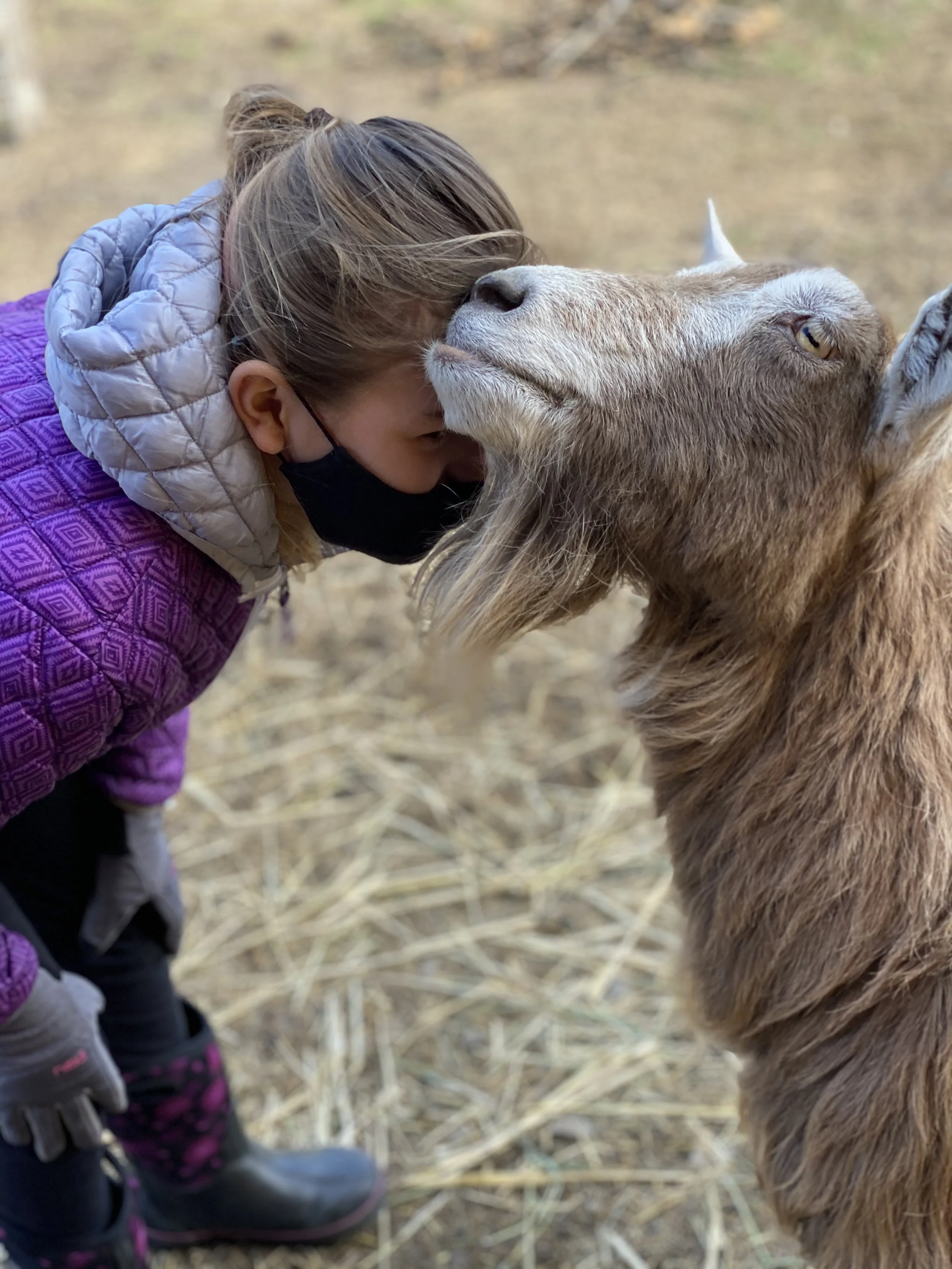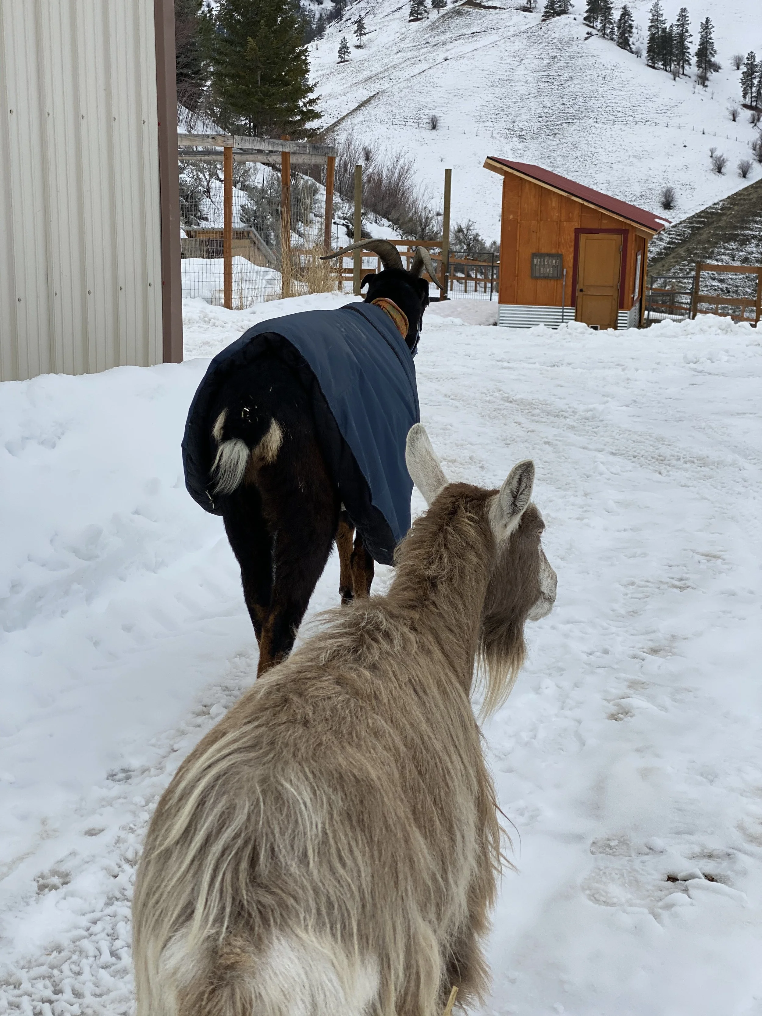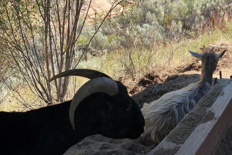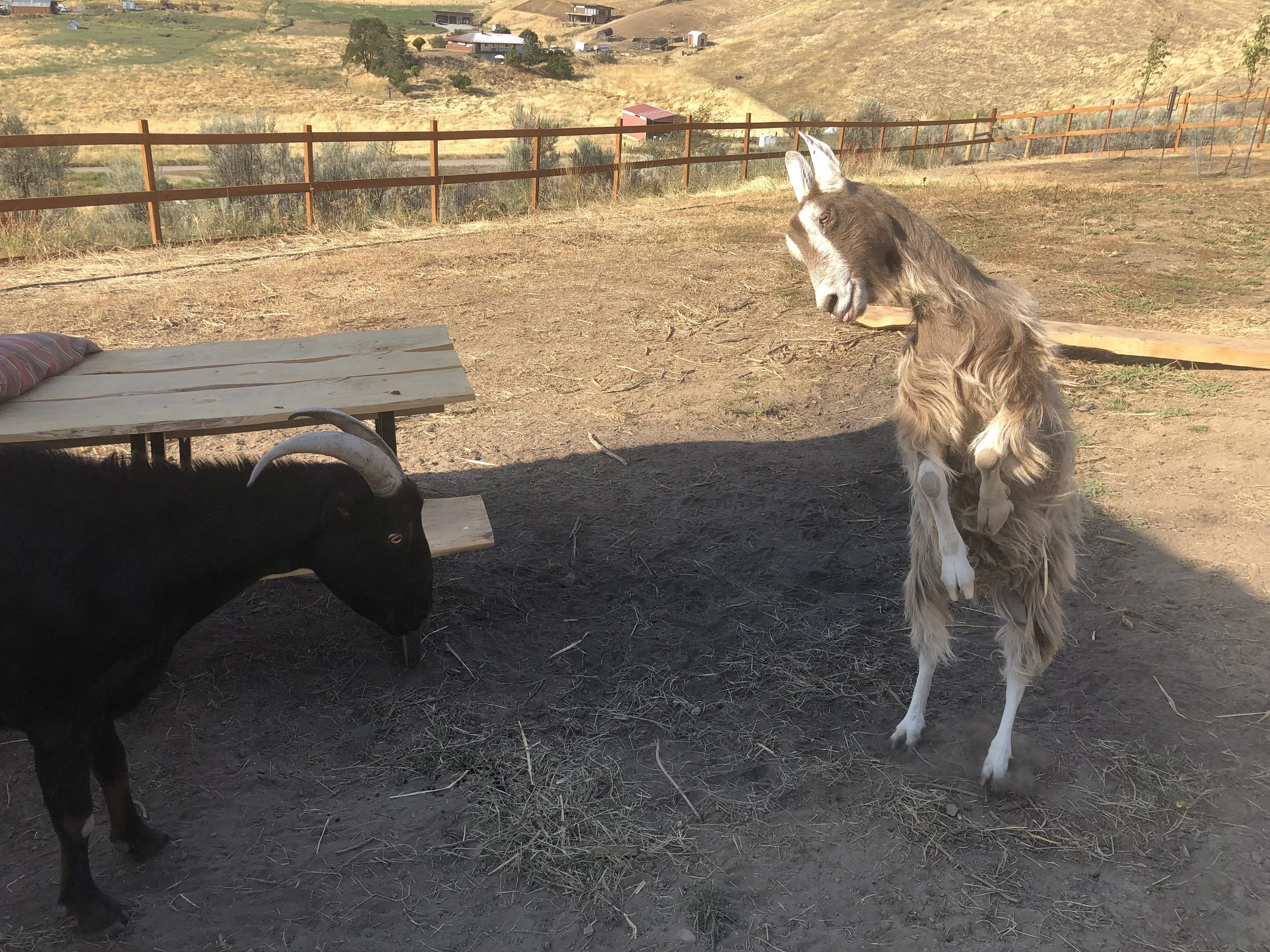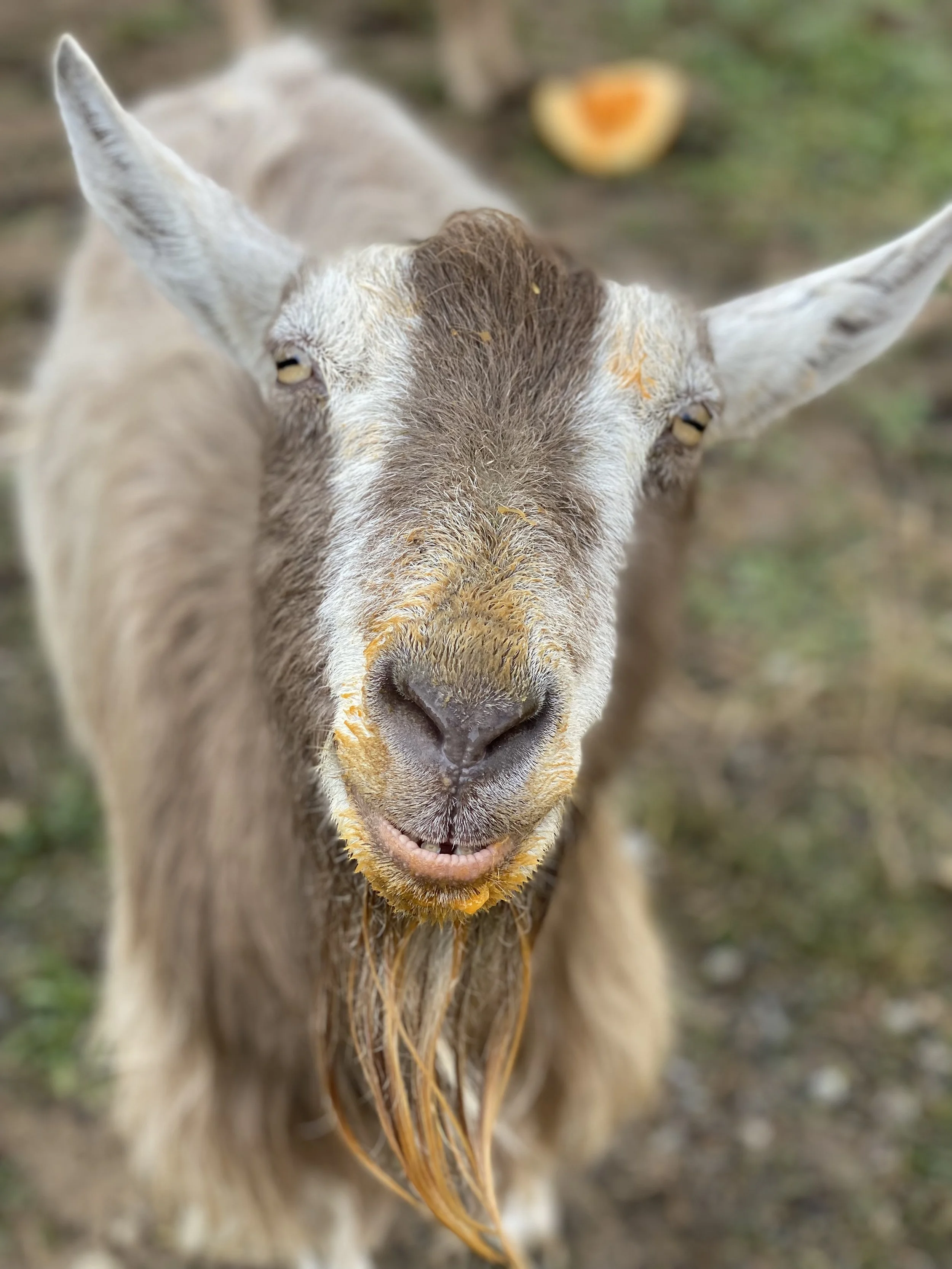 We brought Tulips home in July of 2019. We had recently organized as a WA non-profit, after finding Chino on the side of the road, raising funds to build him a proper home, and of course he couldn’t move in until he had a goat companion. Tulips was the one. I had seen her photo months before on a Petfinder alert with Whatcom County Humane Society in Bellingham. I fell in love with her sweet face and just knew that she was the one. After a long weekend of flying, I drove up to Bellingham and met this special girl. She was not interested in being touched or petted and was quite nervous about the whole thing. So we didn’t waste any time loading her up into the van where I had a large bucket of fresh hay, fresh water, straw bedding, and she nestled in for the loooonnnngggg ride home. She happily ate her hay up by the front seat, gazing out the window as my co-pilot, almost seeming to know, this was it. Her new home, where she would be loved and cared for, for the rest of her life.