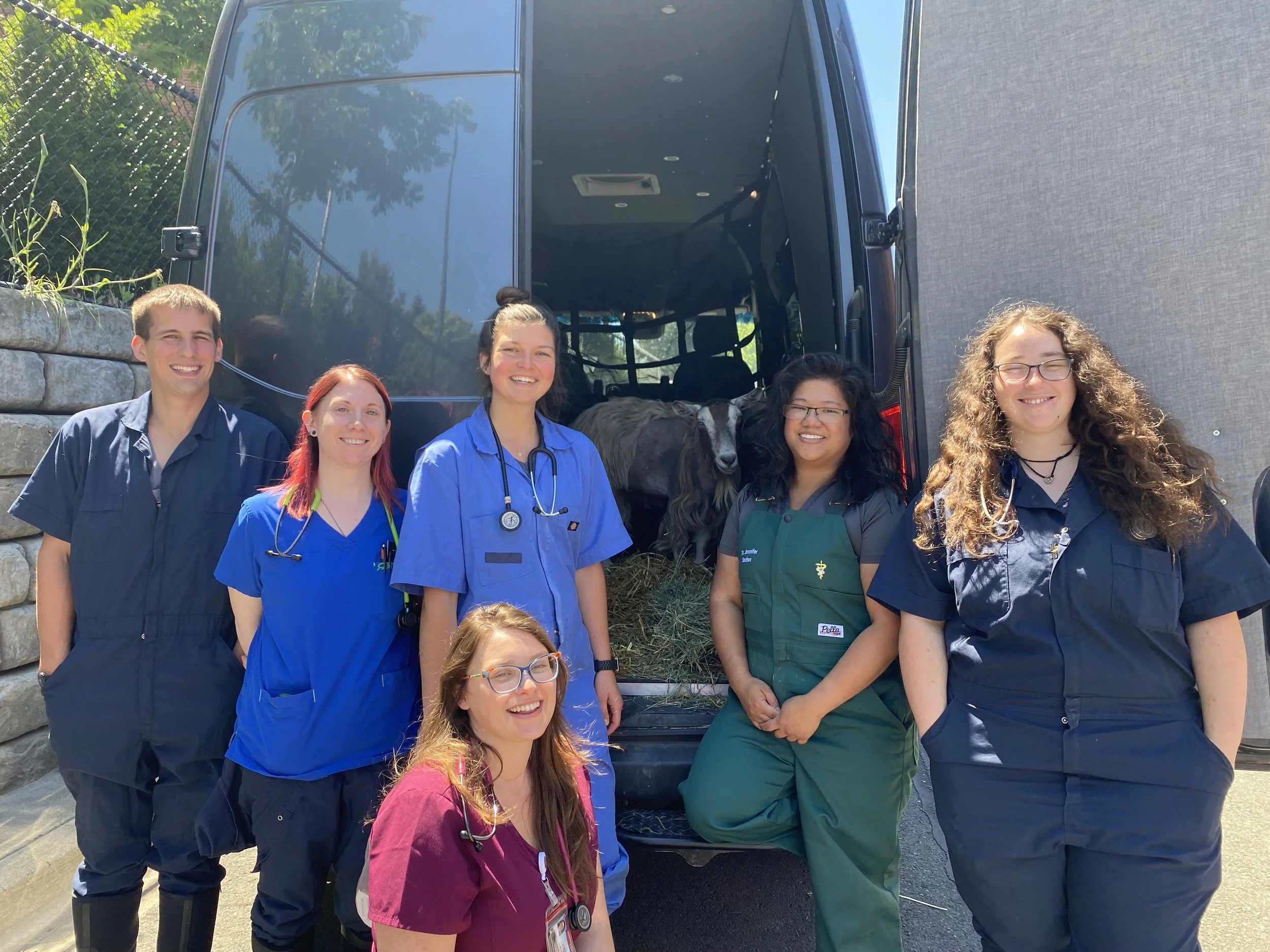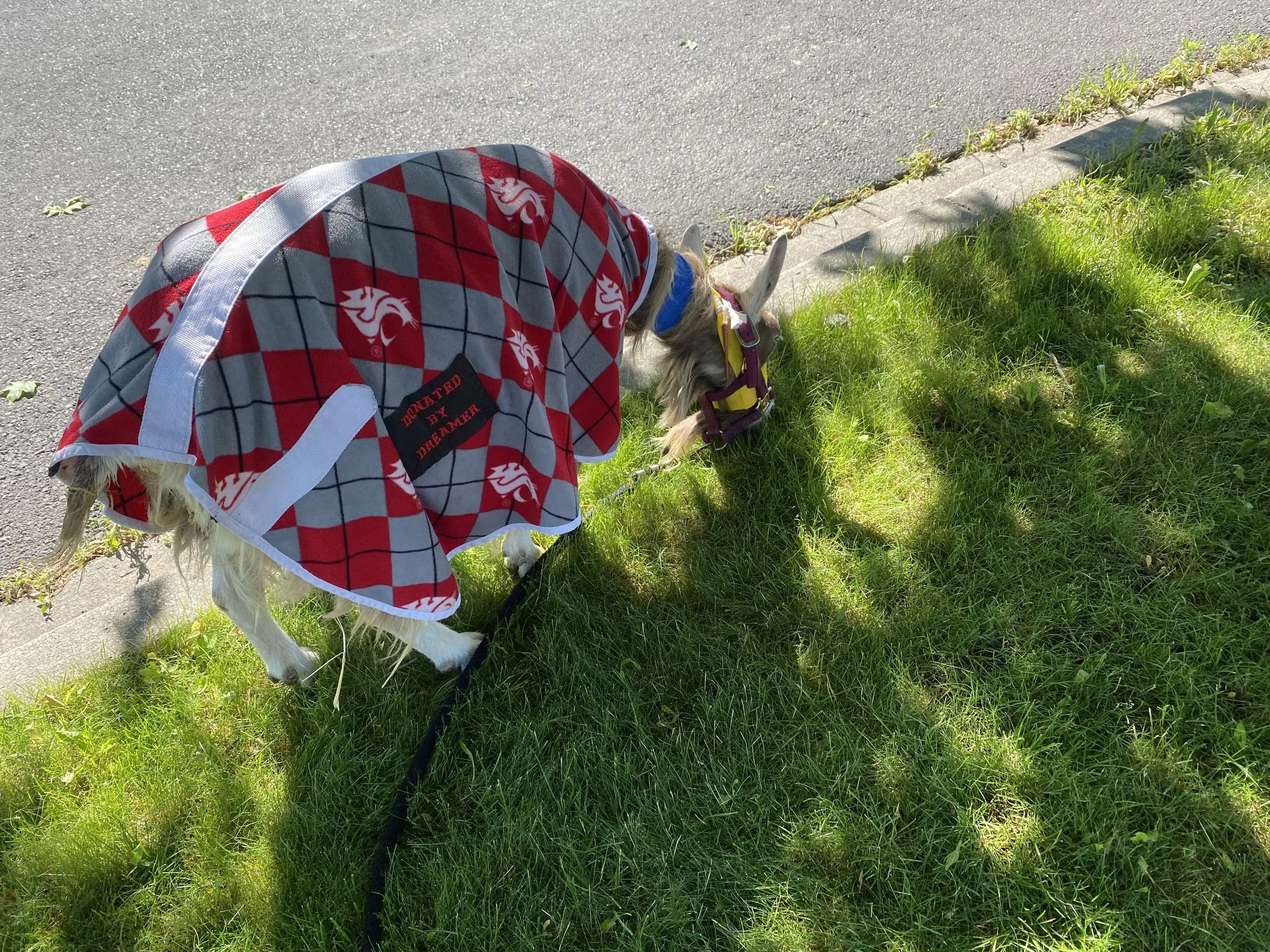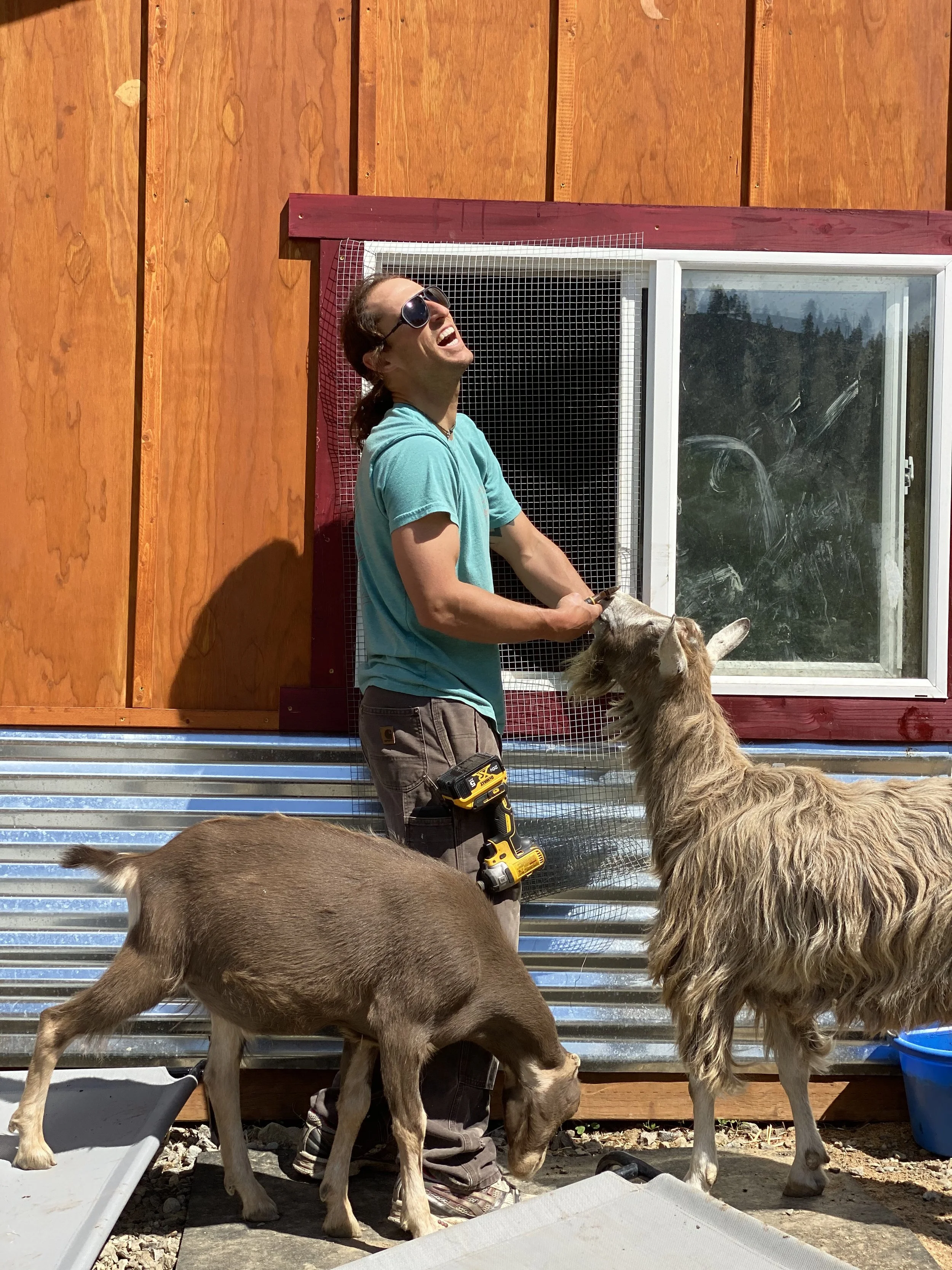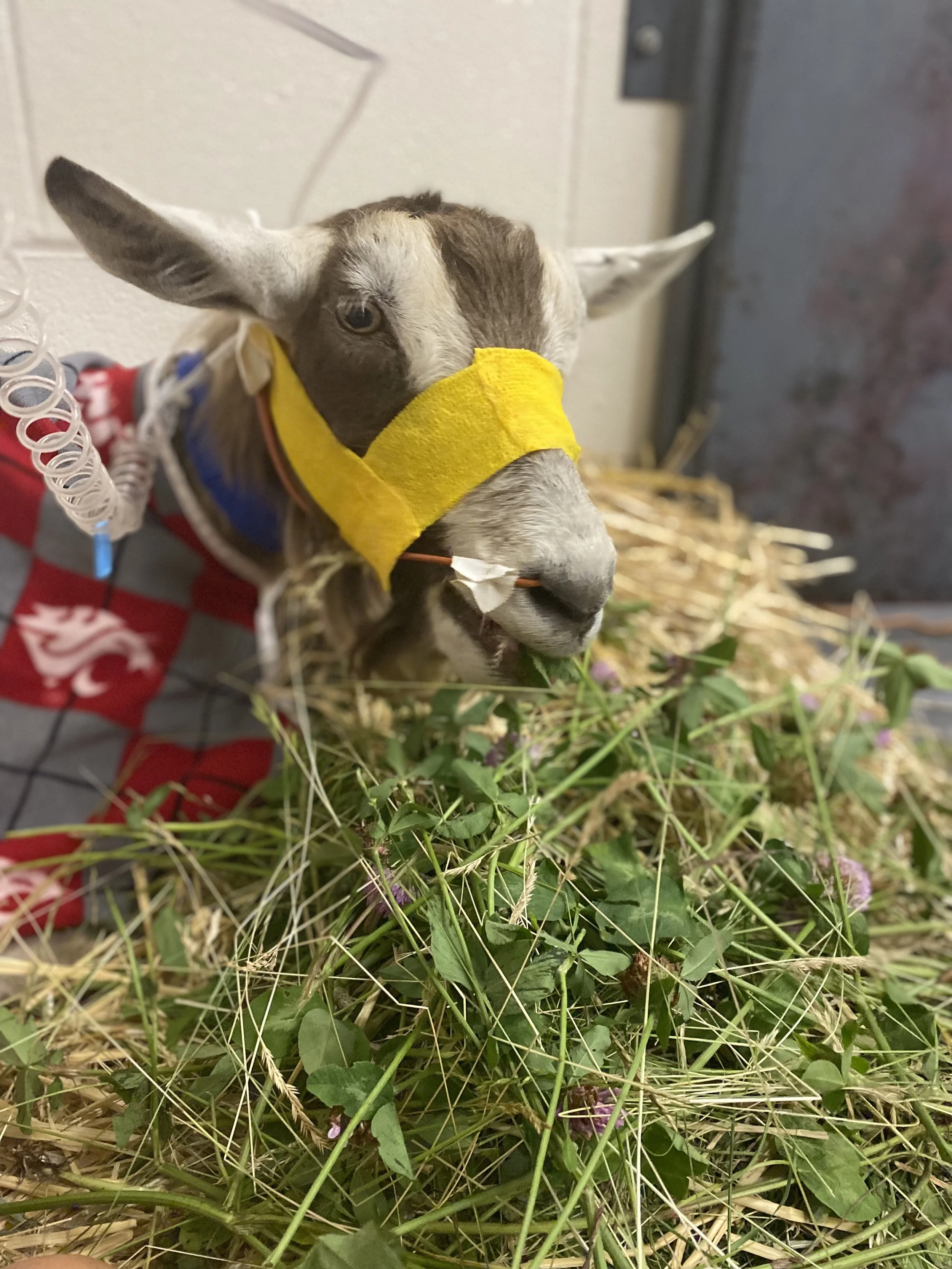 We brought Tulips home in July of 2019. We had recently organized as a WA non-profit, after finding Chino on the side of the road, raising funds to build him a proper home, and of course he couldn’t move in until he had a goat companion. Tulips was the one. I had seen her photo months before on a Petfinder alert with Whatcom County Humane Society in Bellingham. I fell in love with her sweet face and just knew that she was the one. After a long weekend of flying, I drove up to Bellingham and met this special girl. She was not interested in being touched or petted and was quite nervous about the whole thing. So we didn’t waste any time loading her up into the van where I had a large bucket of fresh hay, fresh water, straw bedding, and she nestled in for the loooonnnngggg ride home. She happily ate her hay up by the front seat, gazing out the window as my co-pilot, almost seeming to know, this was it. Her new home, where she would be loved and cared for, for the rest of her life.