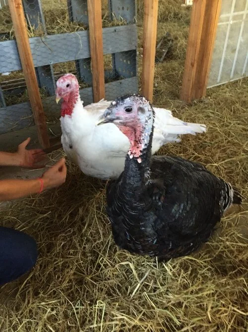 I met my first turkey at Farm Sanctuary in 2016. Turkeys are one of the coolest animals I have spent time with. Curious, clever, playful, affectionate, and family bonded. I witnessed how some enjoyed being gently massaged under their wings or softly stroked down their back. They would purr and make pretty little sounds to show their affection or cuddle up next to a trusted friend and sit for hours. They especially loved my watch and ring, and would curiously but gently peck at them when caught by the light. Male turkeys, Toms, have incredible plumage that make up a tail fan with many different colors. Their heads are magical like a mood ring, changing color with temperament. A turkey with a bright red head is feeling angry or aggressive, but when feeling excited or happy his head will turn blue, and if he is feeling neutral his head will be white. Female turkeys, Hens, are protective, loving mothers. When sitting on her eggs, she will not leave her nest for any reason, and once hatched, you have to get past mom in order to get to her little ones.