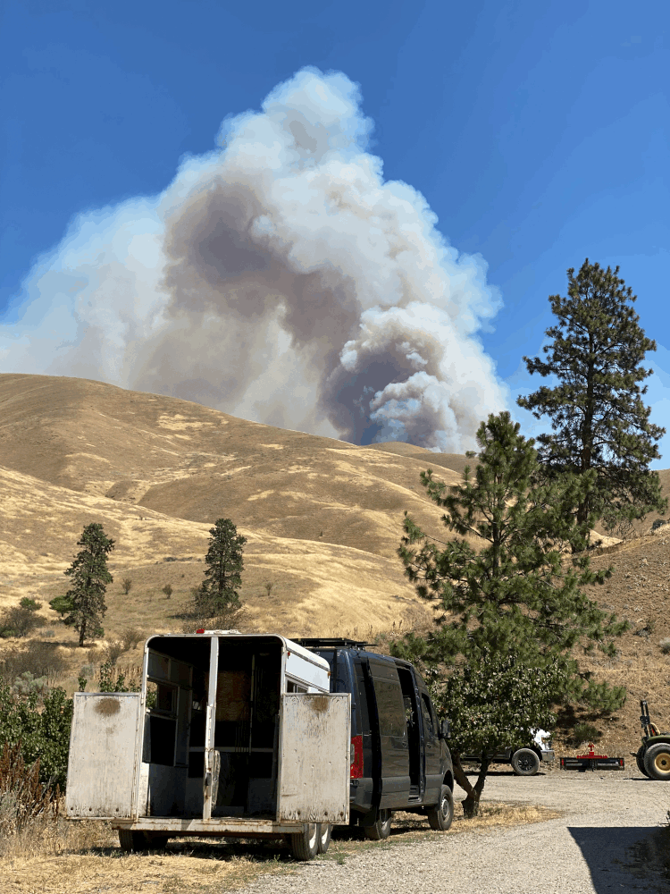 Neither of us could focus on much except the large plume of smoke on the ridgeline. Eric and I continued to work, as able, and we both did a good job of keeping an eye on the plume! About 1:30pm, the plume grew in size and darkened in color. We thought, “this is it. We need to think about leaving.” We alerted a friend to come help, who had been on standby, waiting to help all morning. The plume seemed to lighten again after a little time had gone by and we continued to watch, monitor, and Eric took a little drive for another perspective. By this time the fire had burned all the way East almost to the Columbia River in Wenatchee and was on its way back this way. It had covered some ground in less than a day. We realized we didn’t have to leave yet and that we still had more time, so it might be worth thinking about packing some of our own items as well. Eric packed a bag of clothes and headed down to the shop with a friend to pack up his most important items there. I had a friend, who is seasoned with fire evacuations, walk me through our house and pack up what we wanted from here. All our essentials and most beloved items were in the truck, ready to go. The cops made their way down the canyon knocking on the door of each and every home, leap frogging with multiple cars, so they were sure not to miss a home. They notified us that we were now at a Level 2 evacuation “be ready”. They wanted the number of the folks on our property, what was in each building, generally speaking, and if we planned to stay or go if evacuated. We said, “We are out of here, as soon as we need to be.”