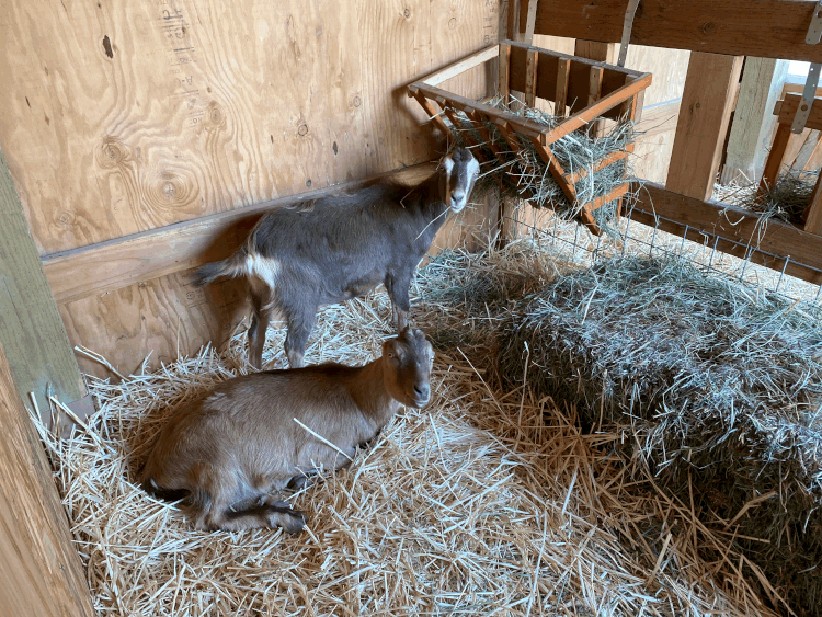 Woody and Sage were two of the lucky ones taken in where they were bottled raised, allowed to stay together, loved, and well taken care of for the first months of their life. They are the sweetest of boys, so affectionate and trusting. Puget Sound Goat Rescue was so sweet and patient trying to help me find the best possible companions for Tulips. We knew we wanted two young boys, if possible, with a sweet demeanor. Girls (does) can be a bit sassy with each other, so we thought it would be best to get males (whethers, neutered males). We were hoping with them being young, it would be easier for Tulips to befriend them and allow her to be the dominant goat, since Chino always had been before. We also were hoping for two together because of the age difference, if something were to happen to Tulips, we wanted to try not to have a lone goat again. Woody and Sage grabbed a special piece of my heart after a few hours of hanging out with a group of young kids. (goats under a year of age are called ‘kids”)They loaded up into our van and were on their way to their new forever home. We had a vet appointment on the way to get them all checked out and when we returned home, they had a few weeks of quarantine in Rosie’s Castle, the pig’s house. The pig boys were kind enough to go on a little vacation, down to the pasture with Tulips in the meantime. They had a wonderful time “aerating” her pasture while they were there. Tulips seemed to enjoy the company and they all co-existed quite nicely.