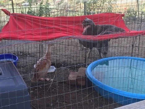 Though she seems to enjoy Pearl and the pigs company, her makeshift quarantine spot was only thought to be for a week or so…and each week or two we think it will be the moment we get to integrate her in with the other birds but, unfortunately we don’t know when that will be. So, Eric has begun building her her own proper duck house. He picked up fencing and a gate today, so tomorrow we will start building her yard and hopefully be able to move her into her own proper space until she can be in with the other birds.
